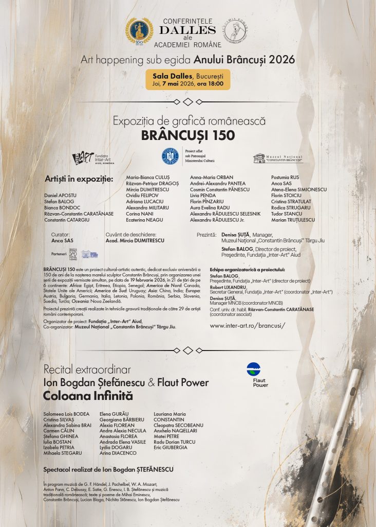Joi, 7 mai 2026, ora 18:00, va avea loc la Sala Dalles, în București, evenimentul Conferințele DALLES ale Academiei Române, 𝐀𝐫𝐭 𝐡𝐚𝐩𝐩𝐞𝐧𝐢𝐧𝐠 𝐬𝐮𝐛 𝐞𝐠𝐢𝐝𝐚 𝐀𝐧𝐮𝐥𝐮𝐢 𝐁𝐫𝐚̂𝐧𝐜𝐮𝐬̦𝐢 𝟐𝟎𝟐𝟔.